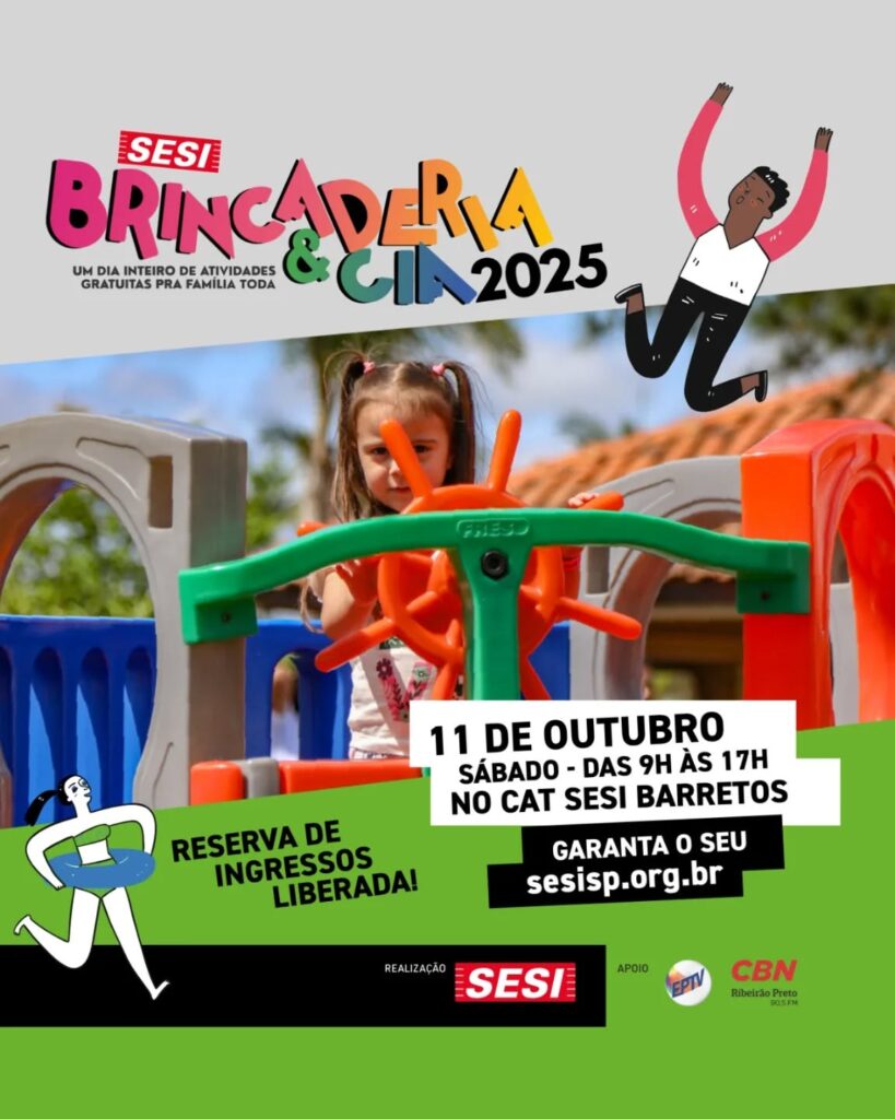 No dia 11 de outubro, o SESI-SP convida você e sua família para o Brincaderia & Cia, um evento totalmente gratuito, das 9h às 17h, no Centro de Atividades do SESI Barretos.