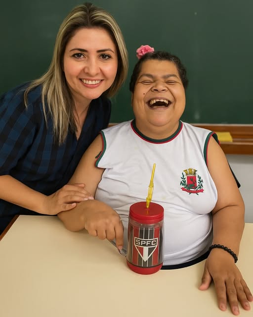 Dessa vez, o registro é entre uma de nossas professoras do EJA e uma aluna assistida — dois sorrisos que refletem o carinho, a dedicação e a alegria de aprender e ensinar com amor.